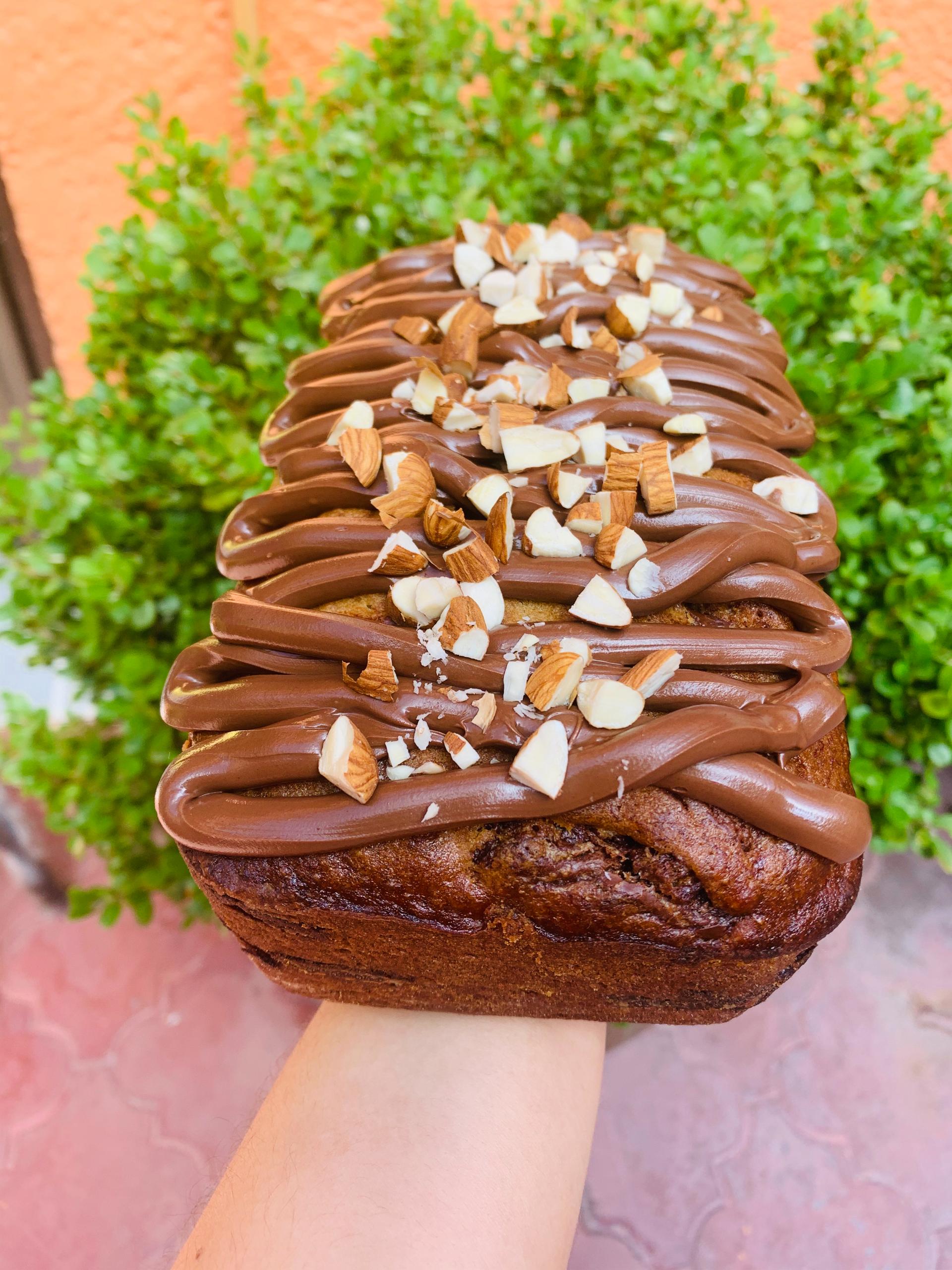 Panqué de plátano relleno y cubierto con Nutella, sobre la cubierta se usa nuez picada como decoración.
