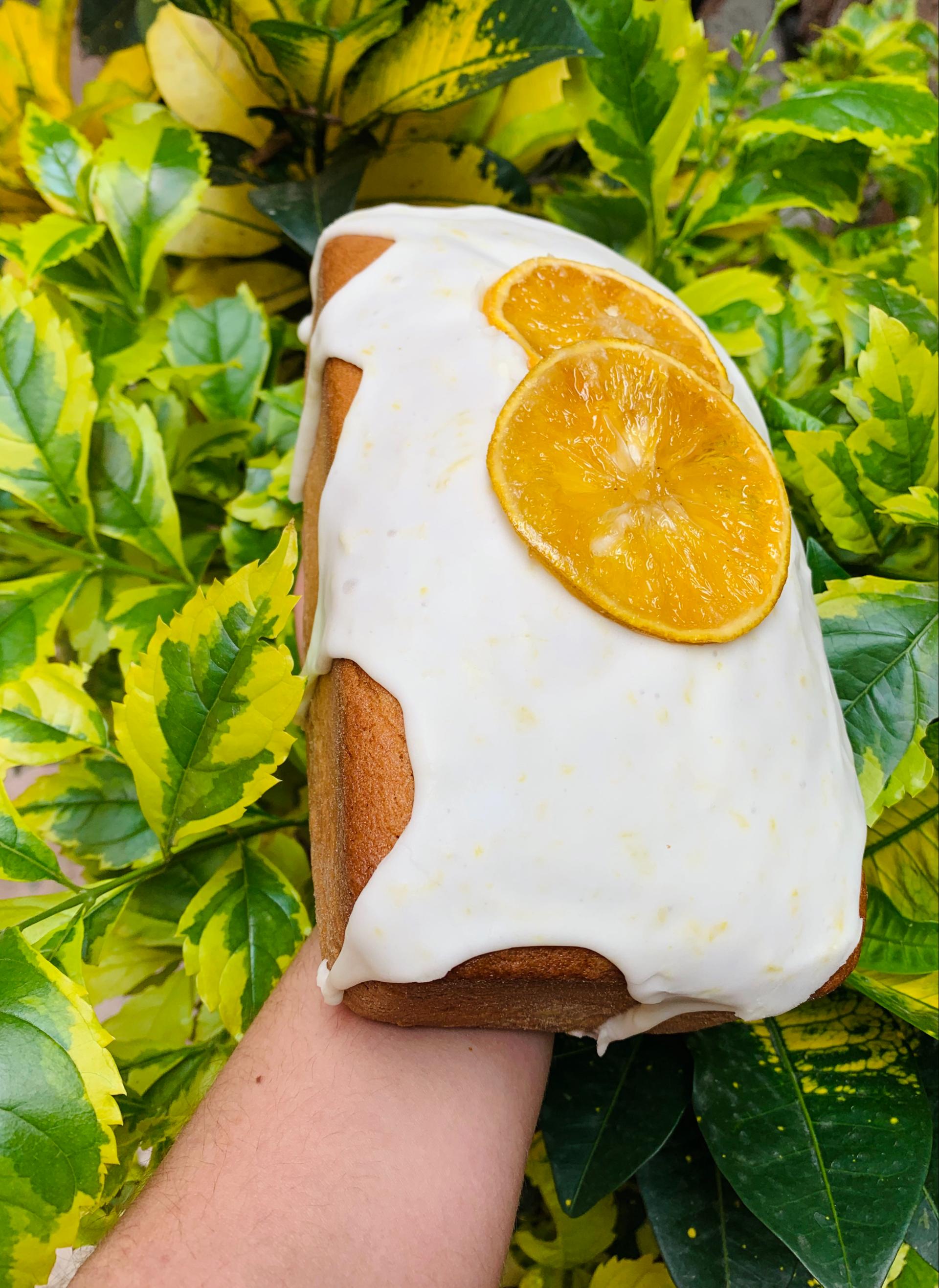 Panqué saborizado de forma natural con ralladura de naranja fresca, cubierto con glaseado de naranja y rodajas de naranja caramelizada como decoración.