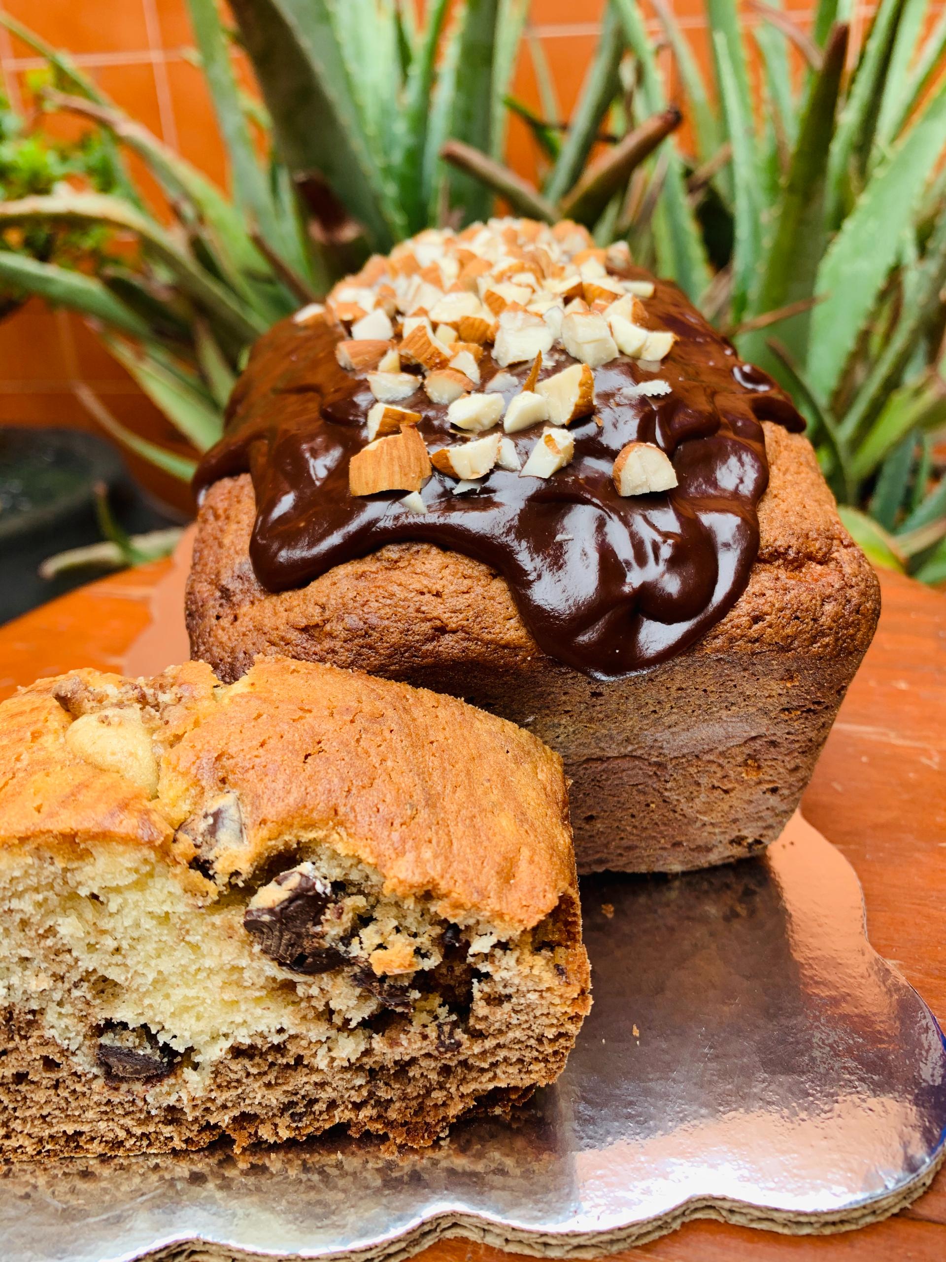 Panqué marmoleado sabor chocolate y vainilla, con chispas de chocolate oscuro en su interior y cubierto con ganache de chocolate oscuro y nuez picada.