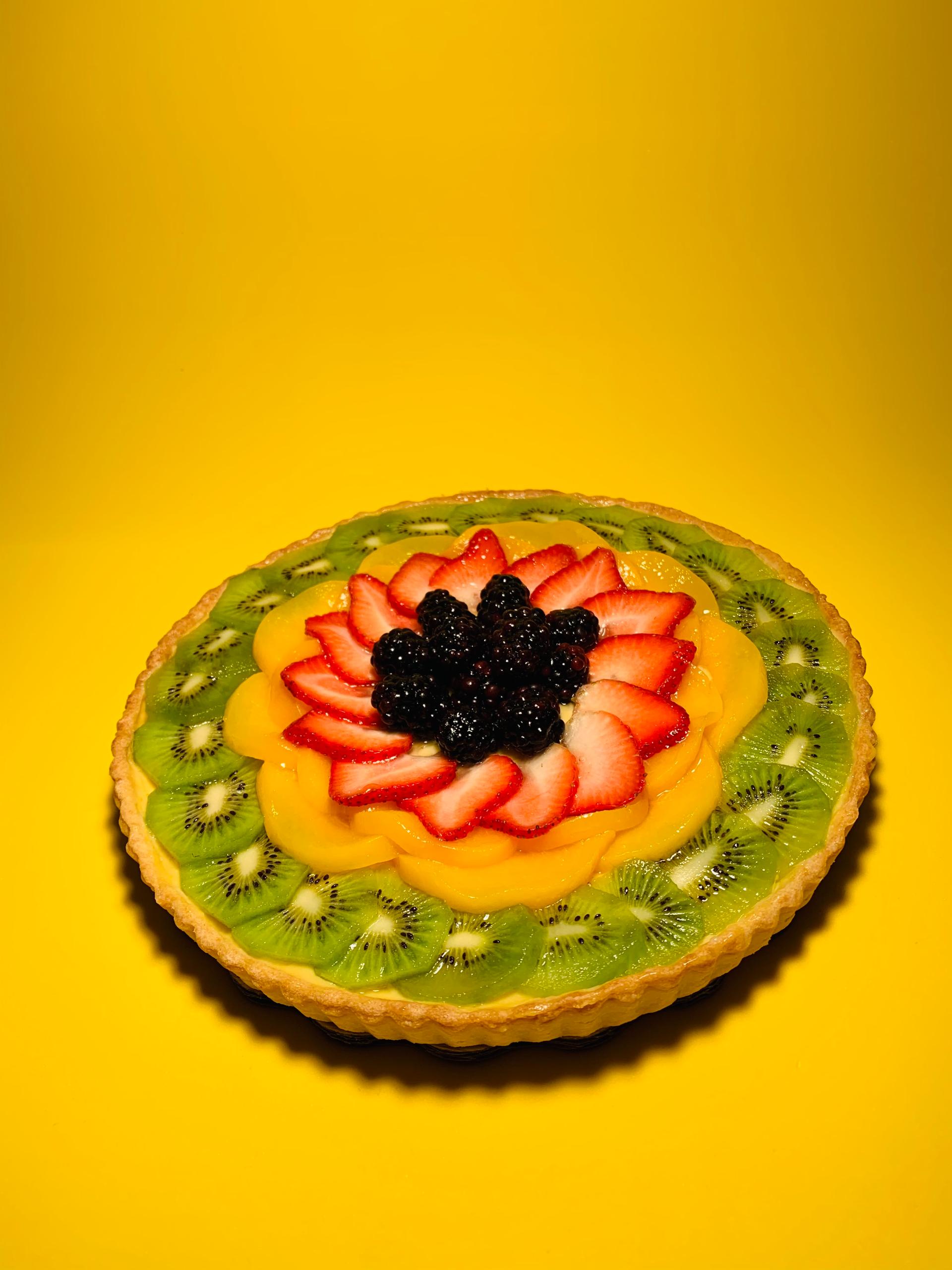 Rellena con una capa de ganache de chocolate oscuro, crema pastelera (100% artesanal, no contiene conservadores ni colorantes) y decorada con fruta (kiwi, durazno, fresa y zarzamoras).